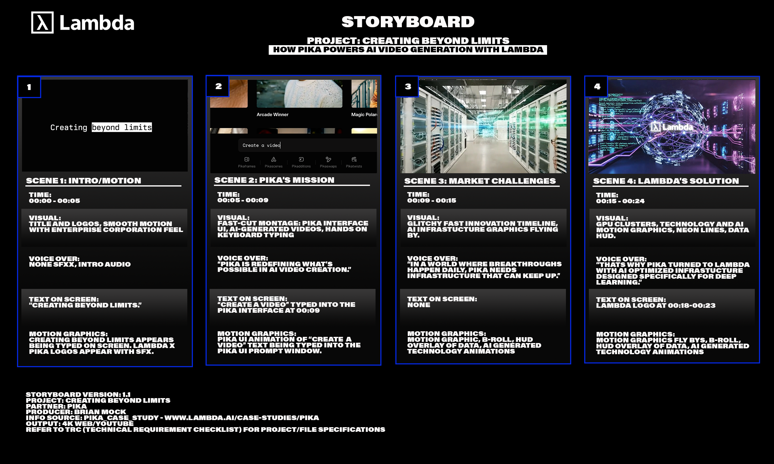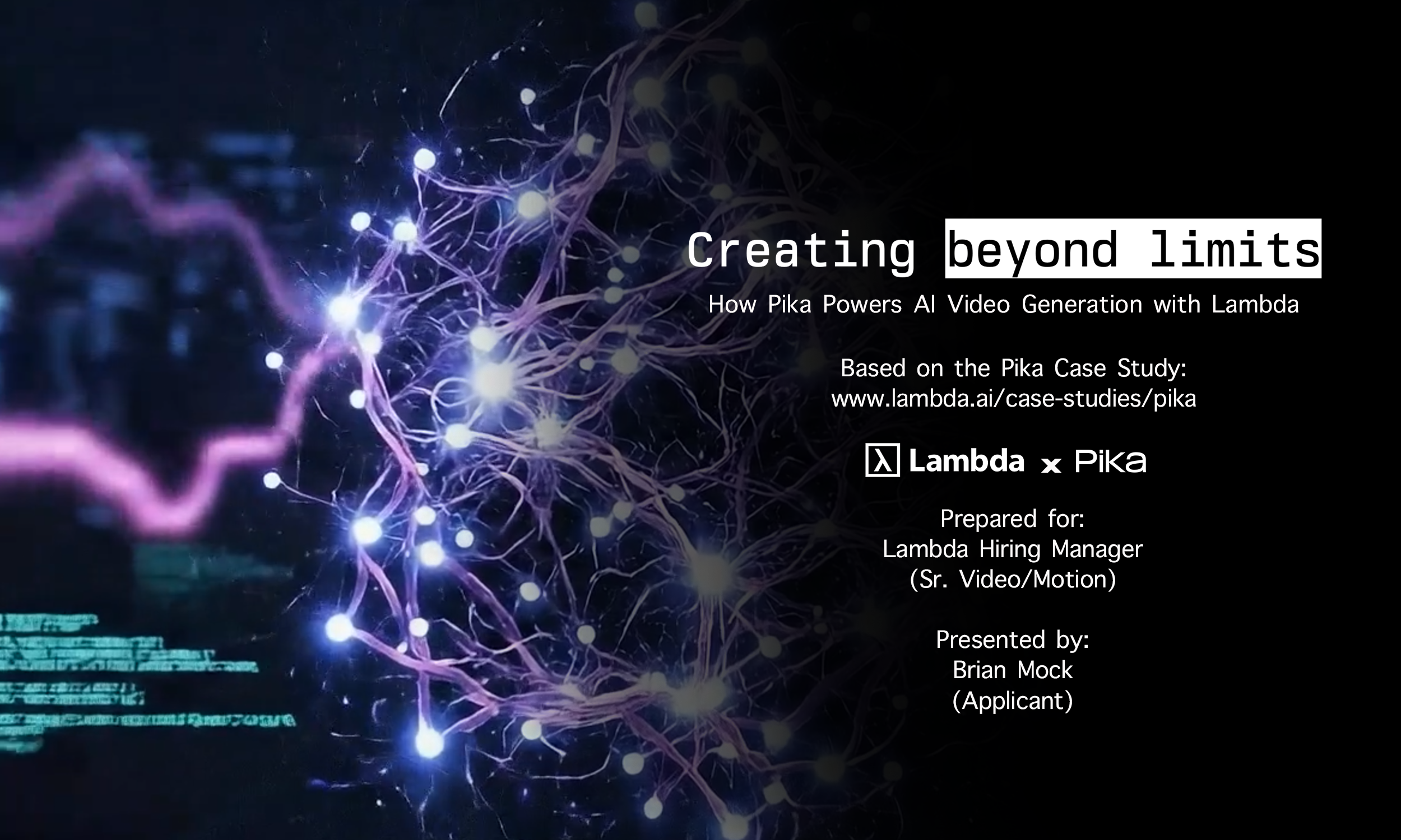 Based on the Pika case study on Lambda’s website. This example uses information from the case study to create video and includes: Video editing, motion graphics, titles, ui animation, screen capture UI, stock footage/graphics, plug in animations (.mogrt), AI images and video using Higgsfield, Kling, Flow/Veo3 and more.